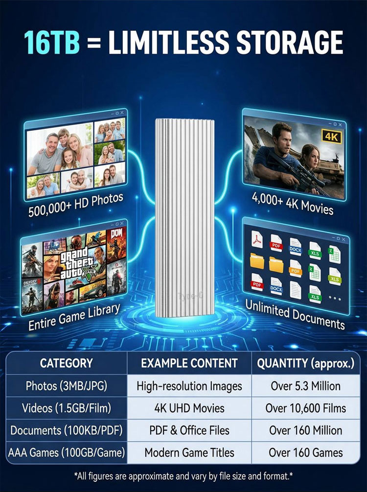Holdsa massive 16TB of data with virtually instant 1000MB/s transfer speeds. 🚀